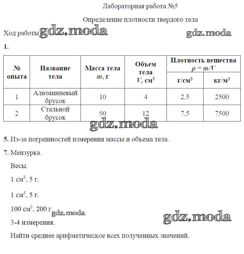 ГДЗ решение к заданию № ЛР №5. Определение плотности твердого тела Физика 7 класс тетрадь для лабораторных работ Минькова Р.Д. (к уч. Перышкина) Экзамен 2017 ФГОС бесплатно на гдз.мода!