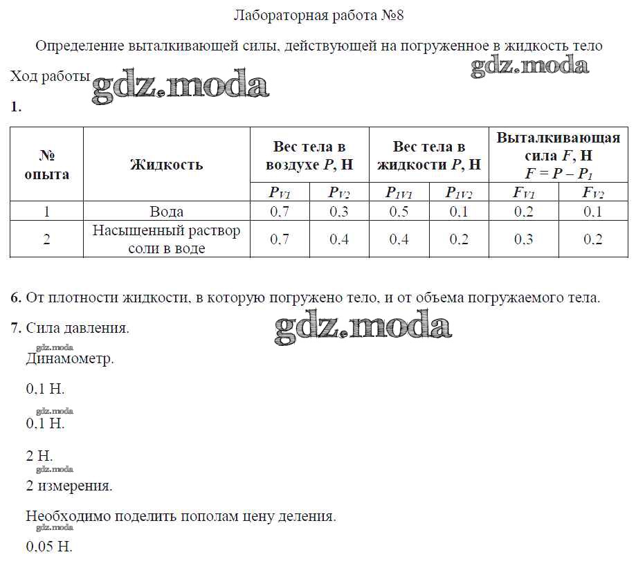 ГДЗ решение к заданию № ЛР №8. Определение выталкивающей силы действующей на погруженное в жидкость тело Физика 7 класс тетрадь для лабораторных работ Минькова Р.Д. (к уч. Перышкина) Экзамен 2017 ФГОС бесплатно на гдз.мода!