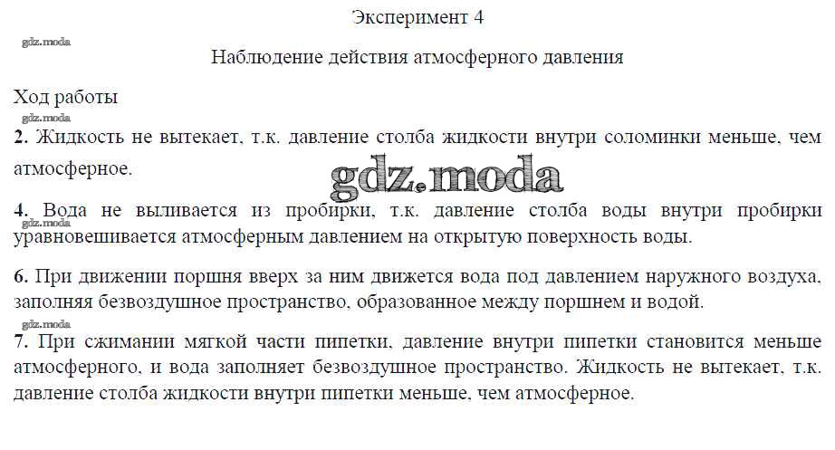 ОТВЕТ на задание № Эксперимент 4. Наблюдение действия атмосферного давления Тетрадь для лабораторных работ по Физике 7 класс Минькова УМК