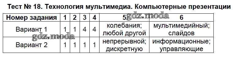 ГДЗ решение к заданию № Тест №18. Технология мультимедиа. Компьютерные презентации Информатика 7 класс контрольно-измерительные материалы Масленикова О.Н. ВАКО 2017 ФГОС бесплатно на гдз.мода!