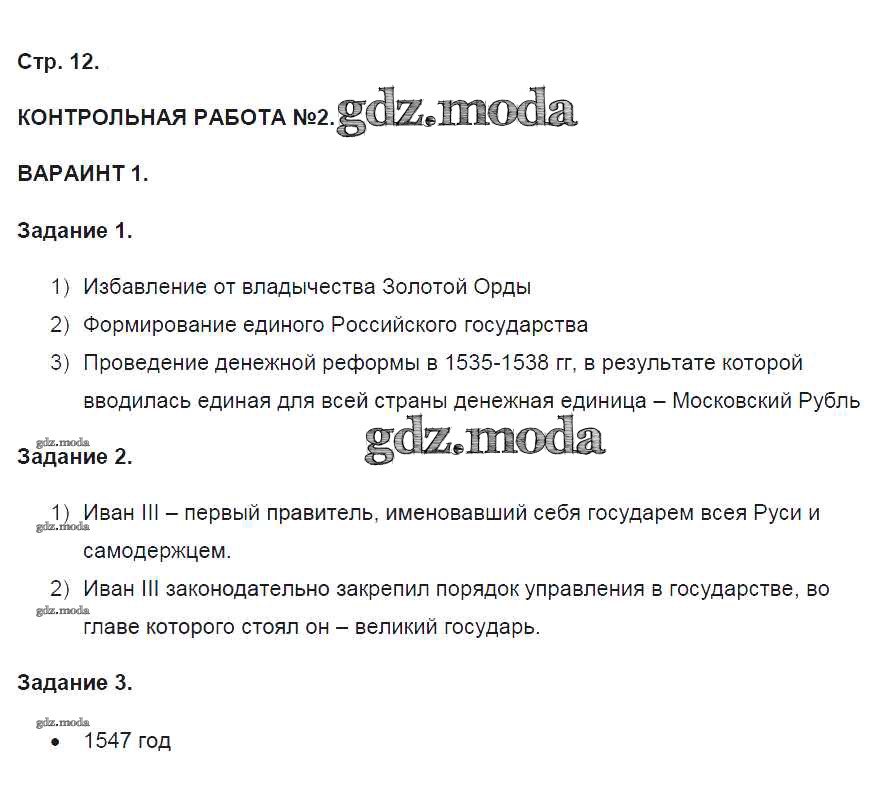 ГДЗ решение к заданию № 12 История России 7 класс контрольные работы Артасов И.А. Просвещение 2016 ФГОС бесплатно на гдз.мода!