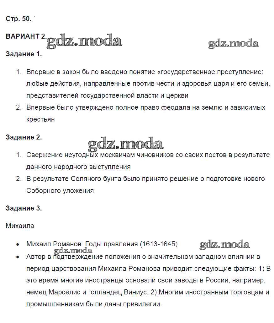ГДЗ решение к заданию № 50 История России 7 класс контрольные работы Артасов И.А. Просвещение 2016 ФГОС бесплатно на гдз.мода!