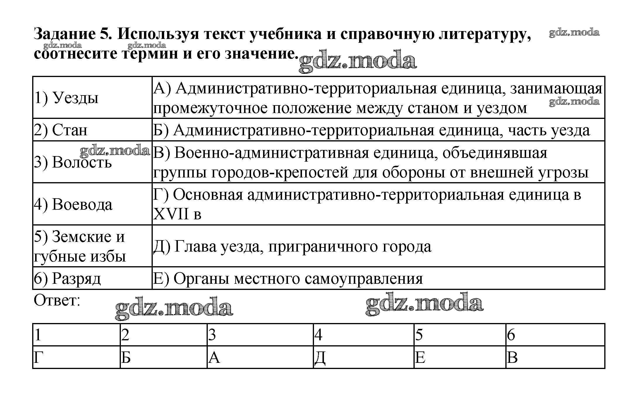 ГДЗ решение к заданию № 5 История России 7 класс рабочая тетрадь Данилов А.А. Просвещение 2016 ФГОС бесплатно на гдз.мода!