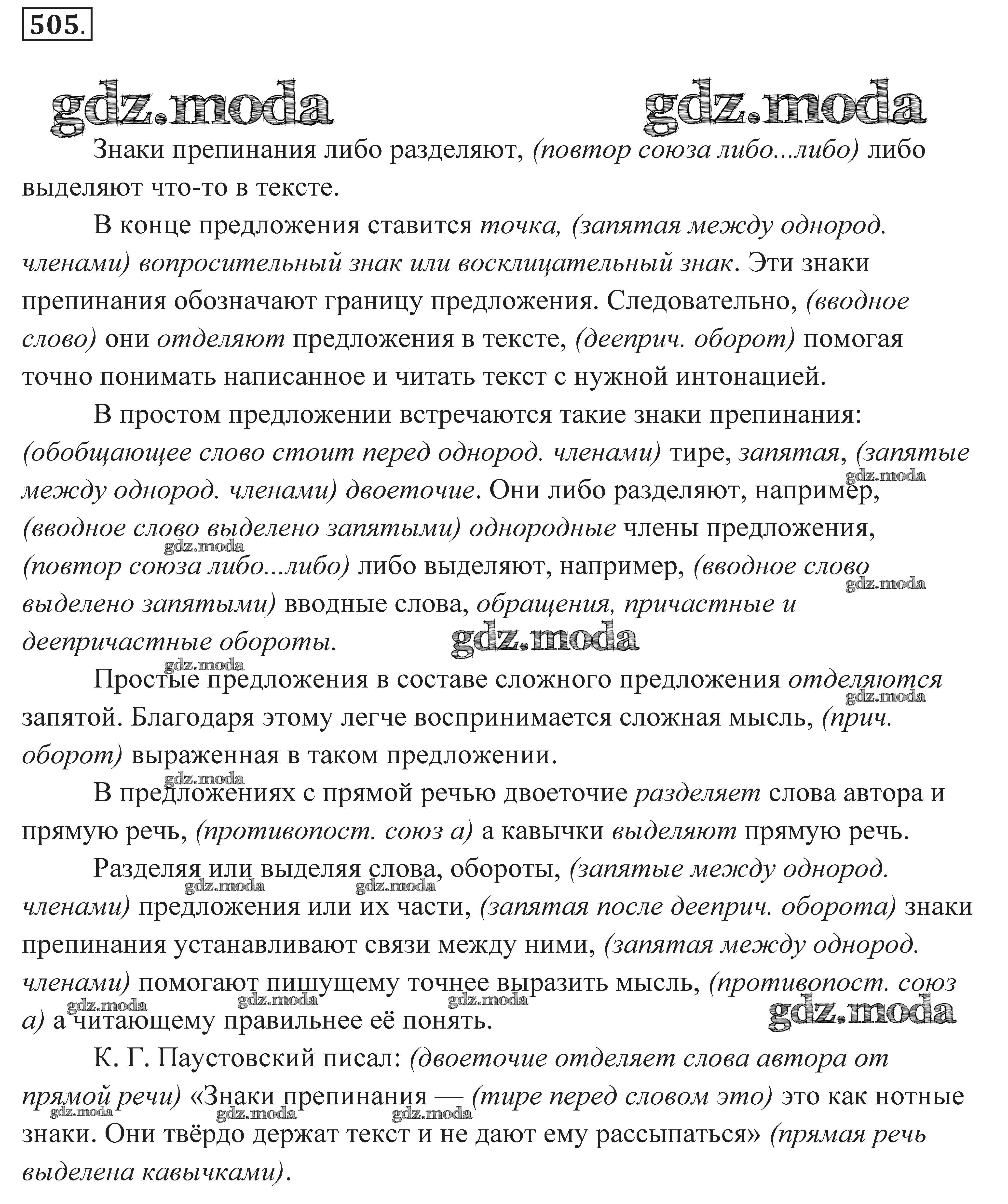 ОТВЕТ на задание № 505 Практика по Русскому языку 7 класс Пименова