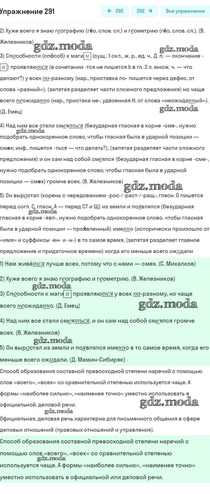 ОТВЕТ на задание № 291 Учебник по Русскому языку 7 класс Рыбченкова