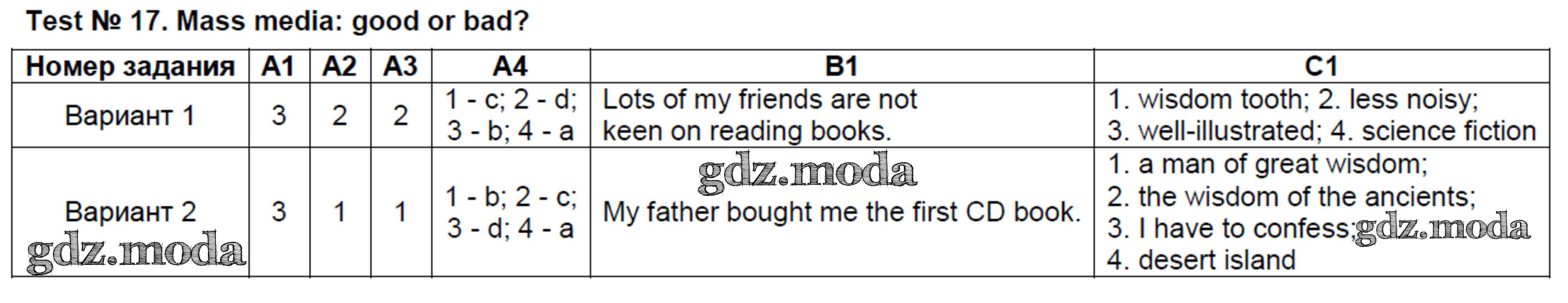 ГДЗ решение к заданию № Test №17. Mass media - good or bad Английский язык 8 класс контрольно-измерительные материалы Лысакова Л.В. ВАКО 2018 ФГОС бесплатно на гдз.мода!