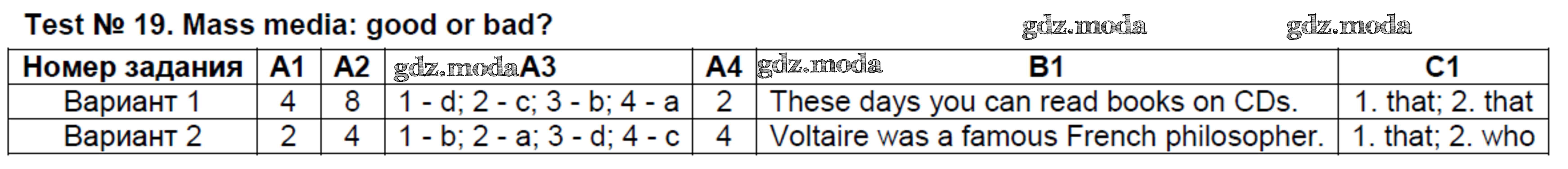ГДЗ решение к заданию № Test №19. Mass media - good or bad Английский язык 8 класс контрольно-измерительные материалы Лысакова Л.В. ВАКО 2018 ФГОС бесплатно на гдз.мода!