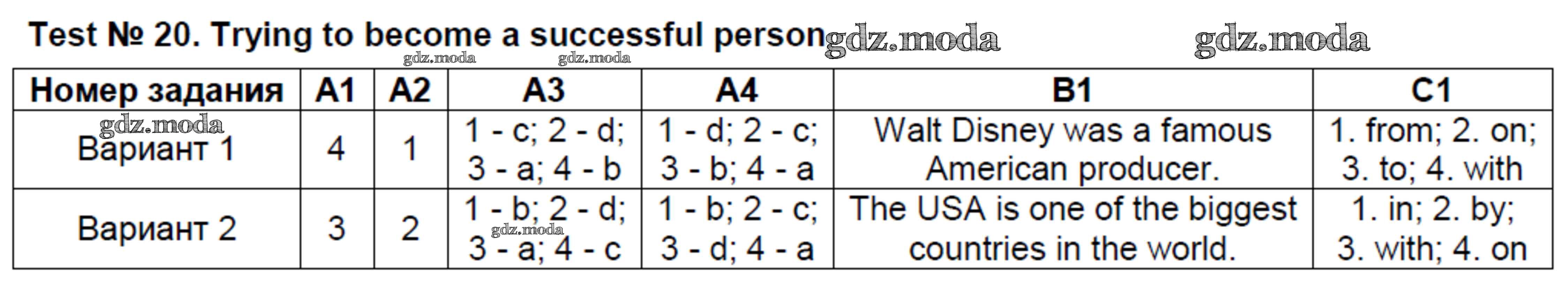 ОТВЕТ на задание № Test №20. Trying to become a successful person Контрольно-измерительные материалы (КИМ) по Английскому языку 8 класс Лысакова