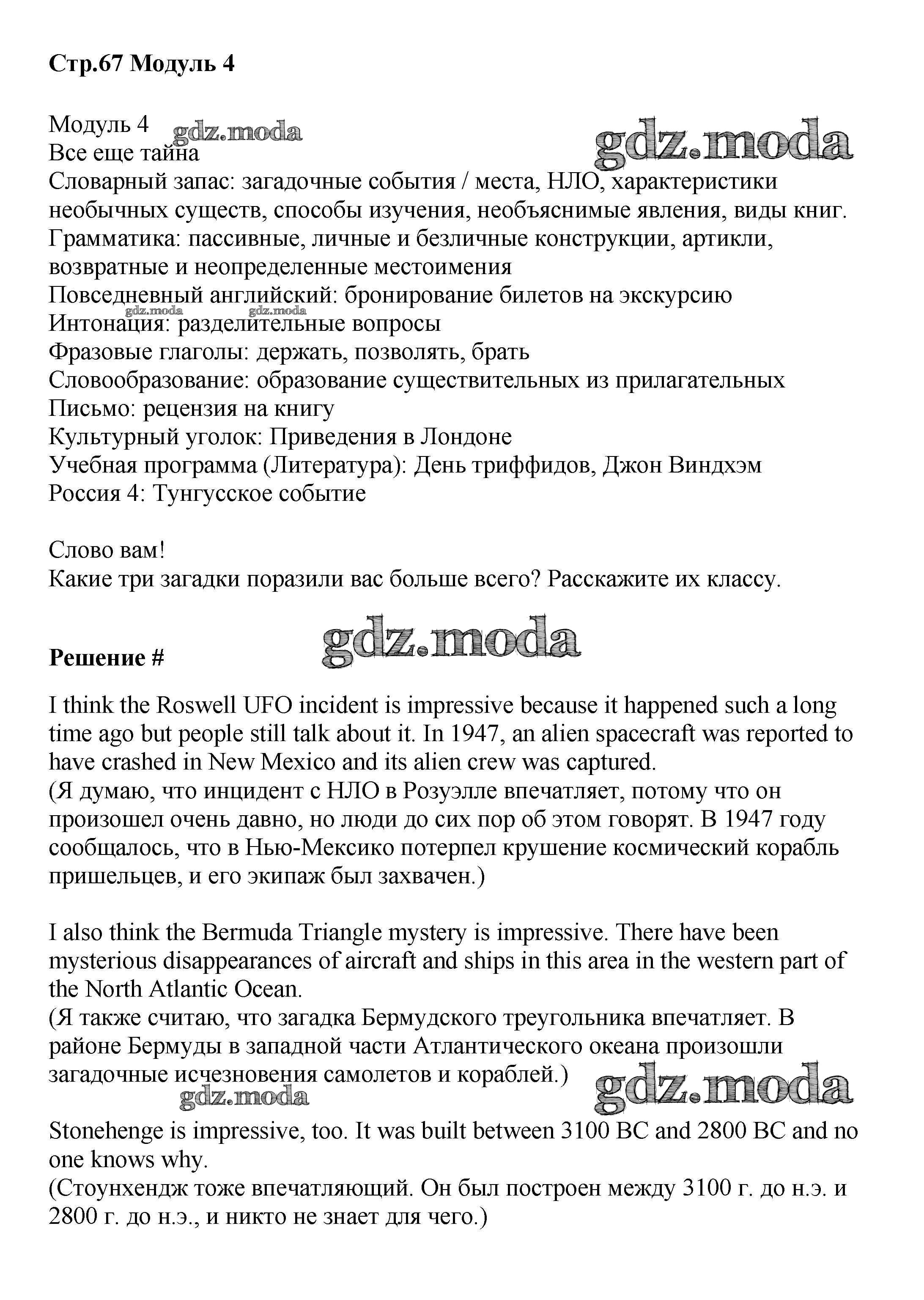 ГДЗ решение к заданию № стр.67 Английский язык 8 класс Starlight Баранова К.М. Просвещение 2016 Углубленный уровень ФГОС бесплатно на гдз.мода!