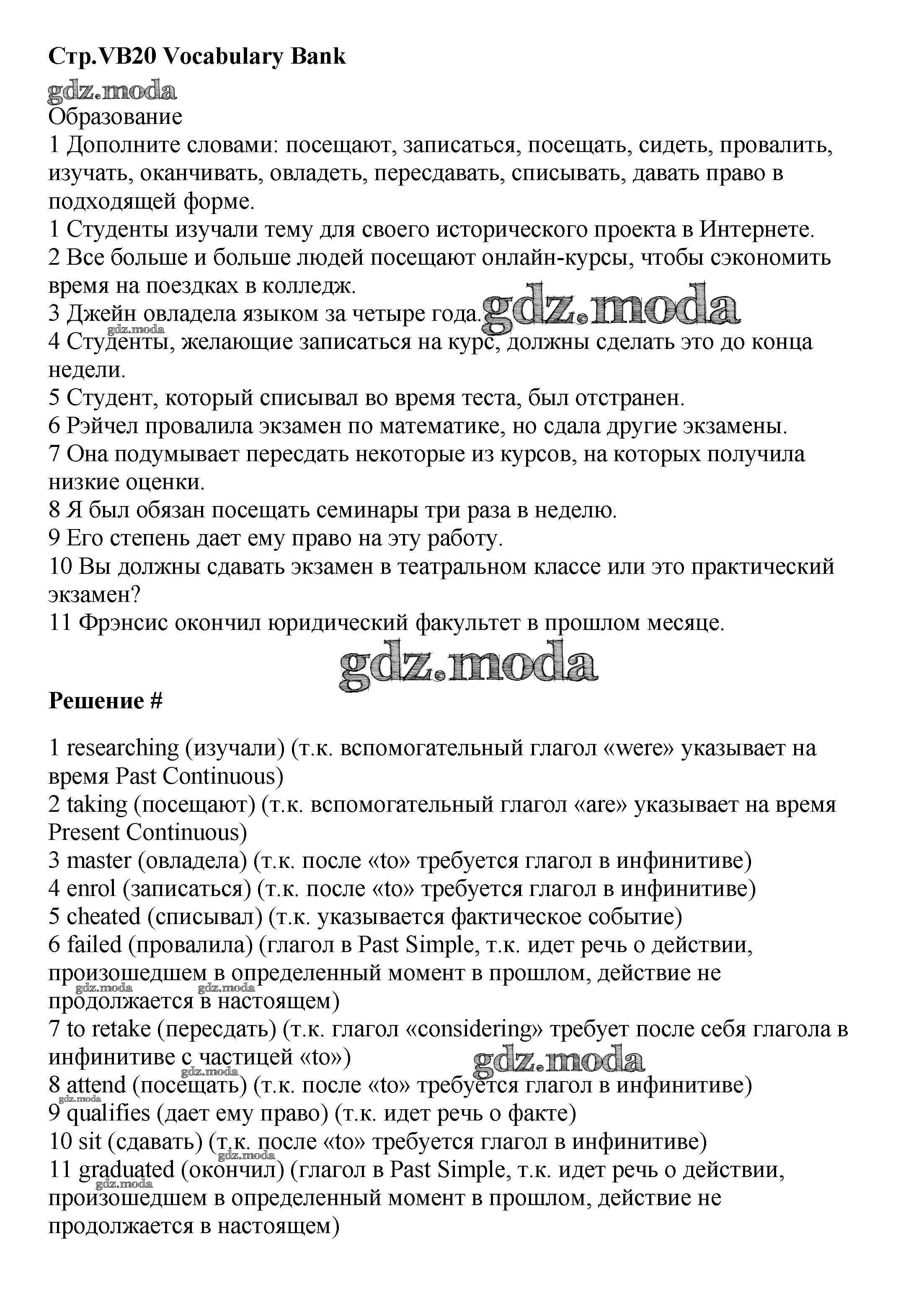 ГДЗ решение к заданию № VB20 Английский язык 8 класс Starlight Баранова К.М. Просвещение 2016 Углубленный уровень ФГОС бесплатно на гдз.мода!