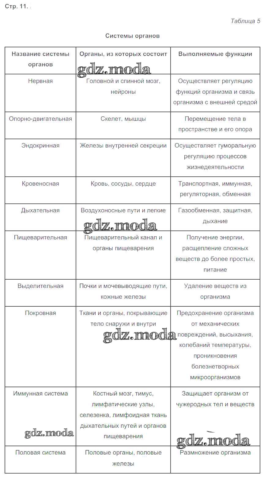 ГДЗ решение к заданию № 11 Биология 8 класс рабочая тетрадь Бодрова Н.Ф. М-книга 2017 ФГОС бесплатно на гдз.мода!