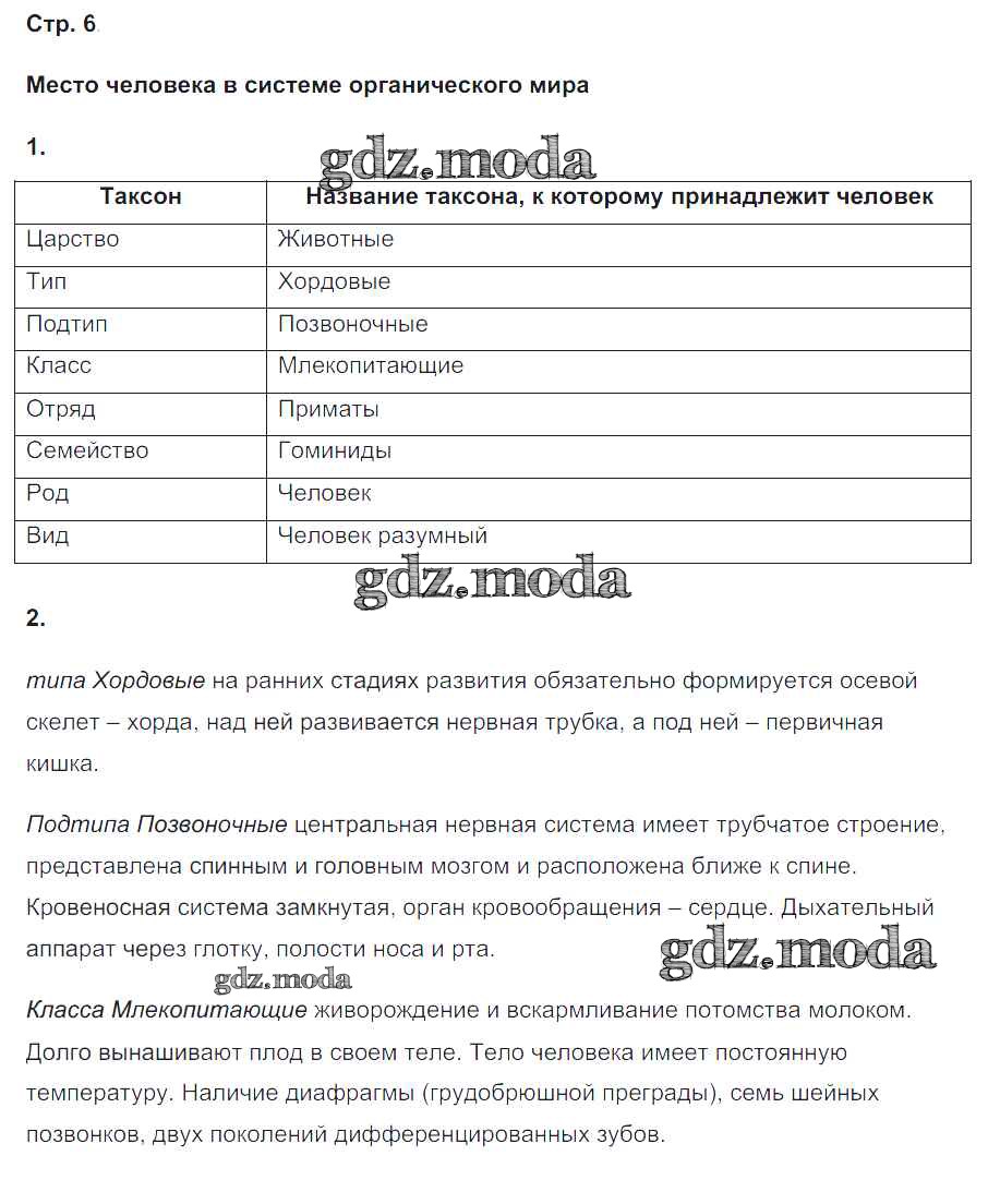 ГДЗ решение к заданию № 6 Биология 8 класс рабочая тетрадь Сонин Н.И. Дрофа 2017 ФГОС бесплатно на гдз.мода!