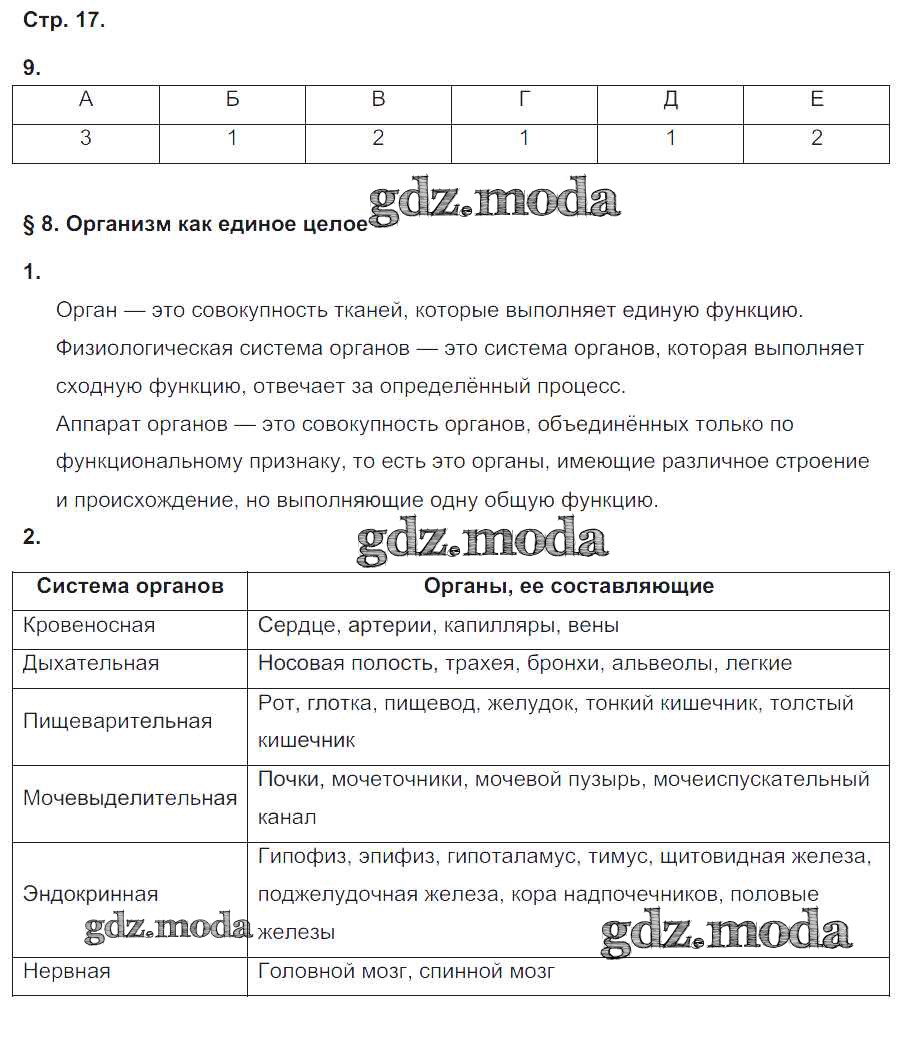 ГДЗ решение к заданию № 17 Биология 8 класс рабочая тетрадь Жемчугова М.Б. Русское слово 2017 ФГОС бесплатно на гдз.мода!