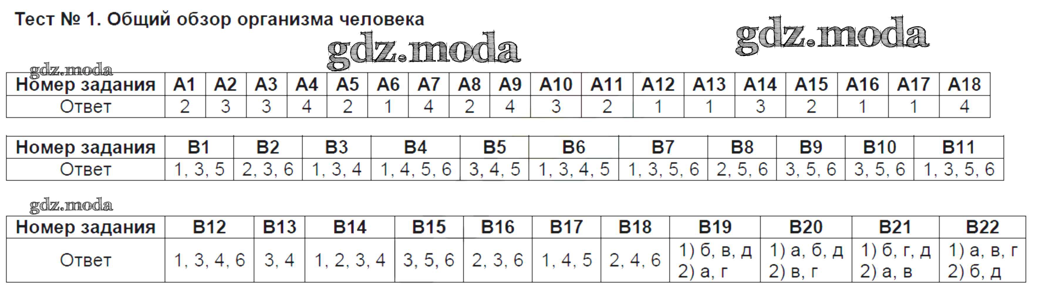 ГДЗ решение к заданию № 1 Биология 8 класс тесты Солодова Е.А. Вентана-граф 2019 ФГОС бесплатно на гдз.мода!