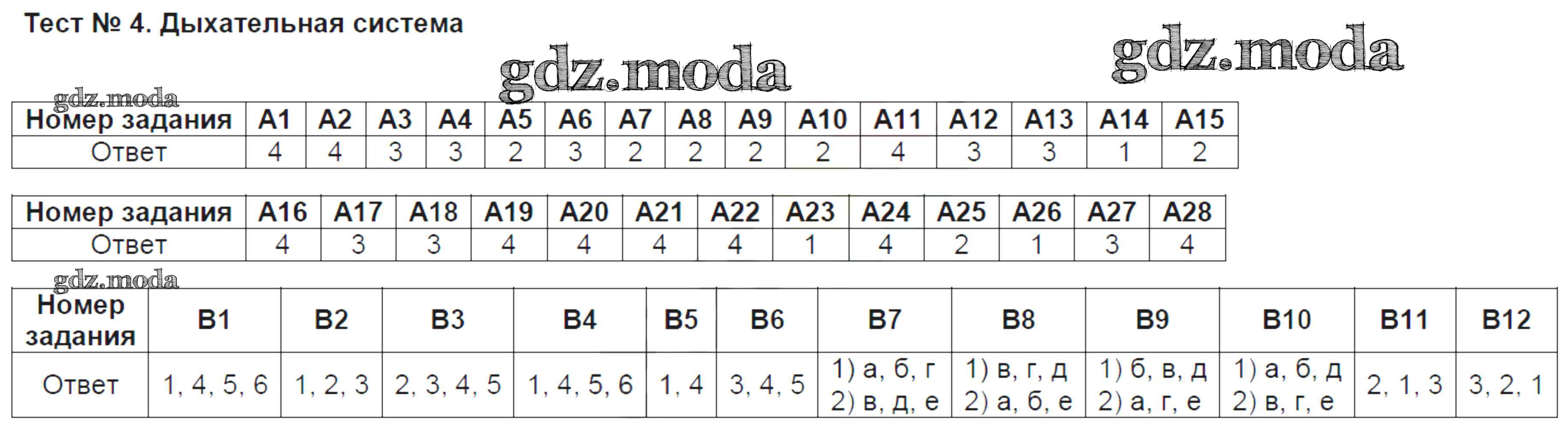 ГДЗ решение к заданию № 4 Биология 8 класс тесты Солодова Е.А. Вентана-граф 2019 ФГОС бесплатно на гдз.мода!