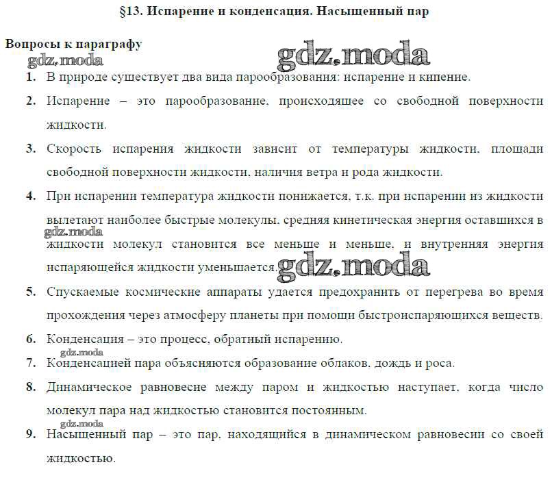 ГДЗ решение к заданию № § 13. Испарение и конденсация. Насыщенный пар Физика 8 класс Громов С.В. Просвещение 2018 ФГОС бесплатно на гдз.мода!