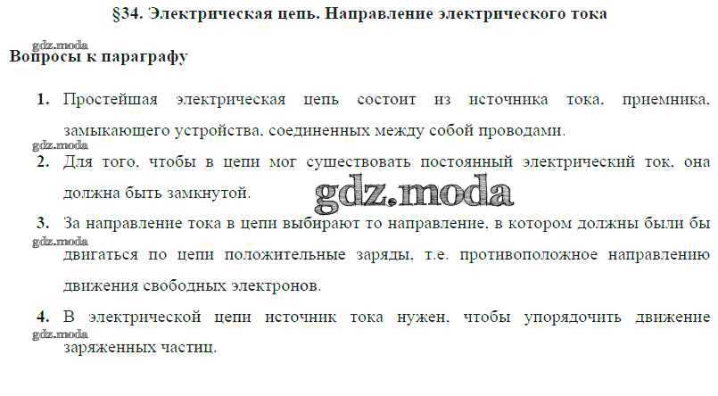 ГДЗ решение к заданию № § 34. Электрическая цепь. Направление электрического тока Физика 8 класс Громов С.В. Просвещение 2018 ФГОС бесплатно на гдз.мода!