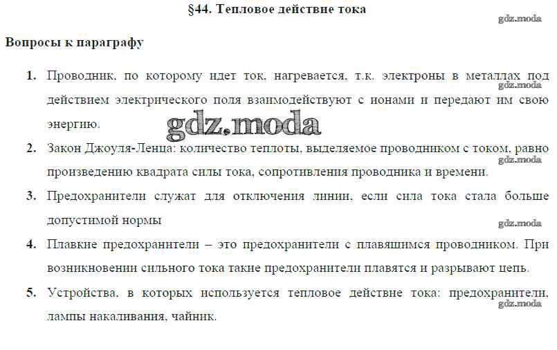 ГДЗ решение к заданию № § 44. Тепловое действие тока Физика 8 класс Громов С.В. Просвещение 2018 ФГОС бесплатно на гдз.мода!