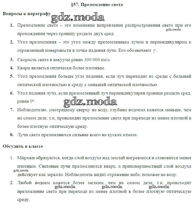 ГДЗ решение к заданию № § 57. Преломление света Физика 8 класс Громов С.В. Просвещение 2018 ФГОС бесплатно на гдз.мода!