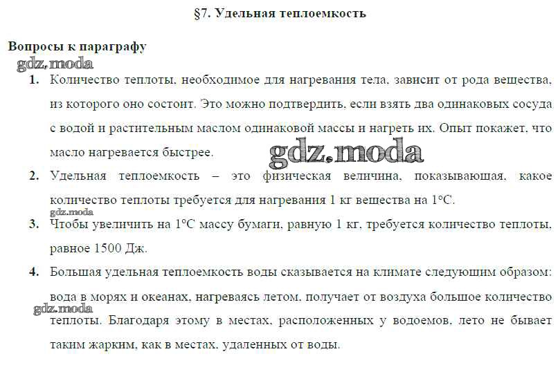 ГДЗ решение к заданию № § 7. Удельная теплоемкость Физика 8 класс Громов С.В. Просвещение 2018 ФГОС бесплатно на гдз.мода!