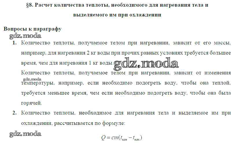 ГДЗ решение к заданию № § 8. Расчет количества теплоты, необходимого для нагревания тела и выделяемого им при охлаждении Физика 8 класс Громов С.В. Просвещение 2018 ФГОС бесплатно на гдз.мода!