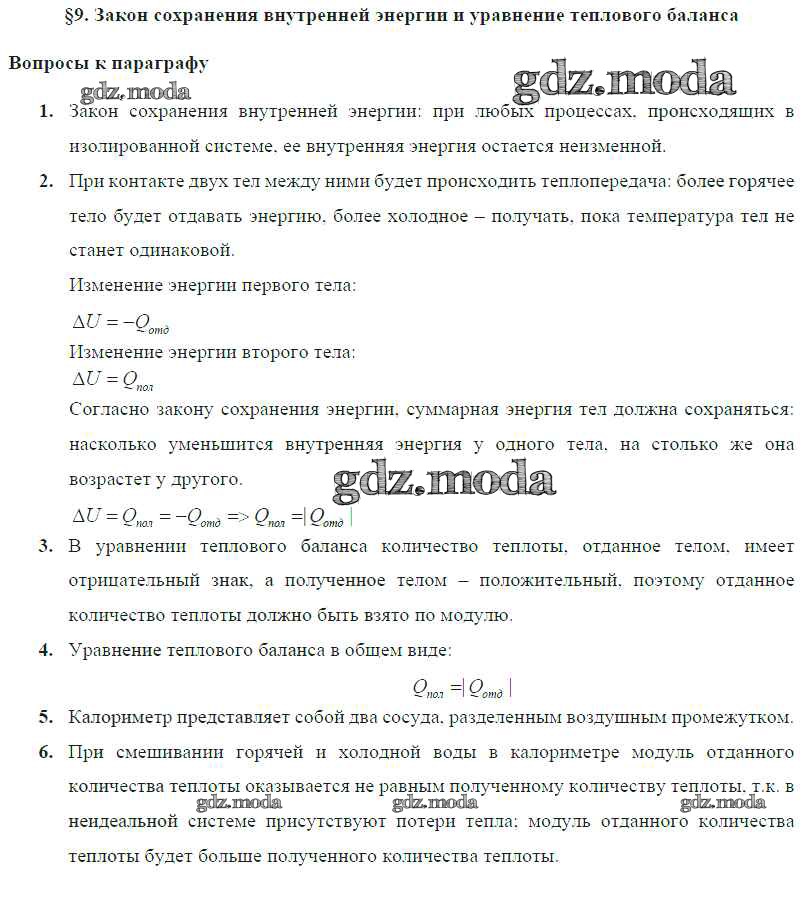 ГДЗ решение к заданию № § 9. Закон сохранения внутренней энергии и уравнение теплового баланса Физика 8 класс Громов С.В. Просвещение 2018 ФГОС бесплатно на гдз.мода!