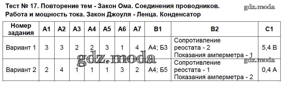 ГДЗ решение к заданию № Тест-17. Повторение тем - Закон Ома. Соединения проводников и др. Физика 8 класс контрольно-измерительные материалы (КИМ) Бобошина С.Б. Экзамен 2014 ФГОС бесплатно на гдз.мода!