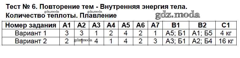 ГДЗ решение к заданию № Тест-6. Повторение тем - Внутренняя энергия тела. Количество теплоты. Плавление Физика 8 класс контрольно-измерительные материалы (КИМ) Бобошина С.Б. Экзамен 2014 ФГОС бесплатно на гдз.мода!