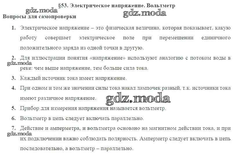 ГДЗ решение к заданию № § 53. Электрическое напряжение. Вольтметр Физика 8 класс Пурышева Н.С. Дрофа 2017 ФГОС бесплатно на гдз.мода!