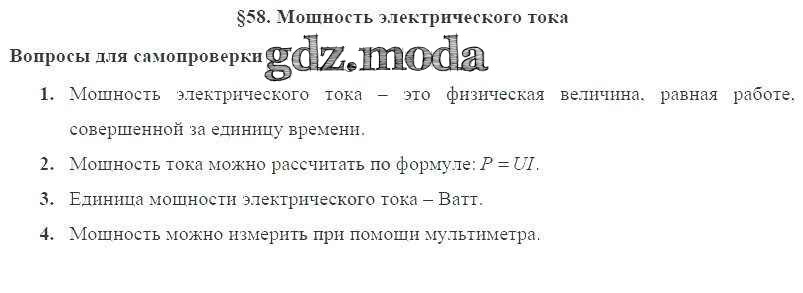 ГДЗ решение к заданию № § 58. Мощность электрического тока Физика 8 класс Пурышева Н.С. Дрофа 2017 ФГОС бесплатно на гдз.мода!