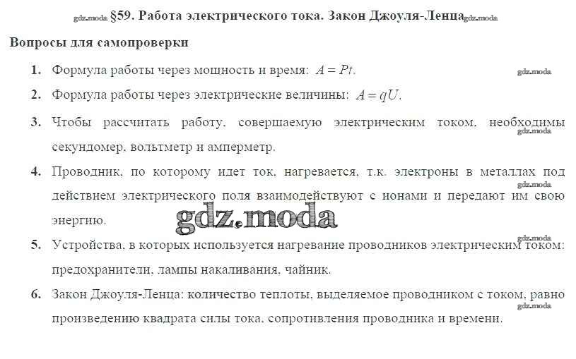 ГДЗ решение к заданию № § 59. Работа электрического тока. Закон Джоуля-Ленца Физика 8 класс Пурышева Н.С. Дрофа 2017 ФГОС бесплатно на гдз.мода!