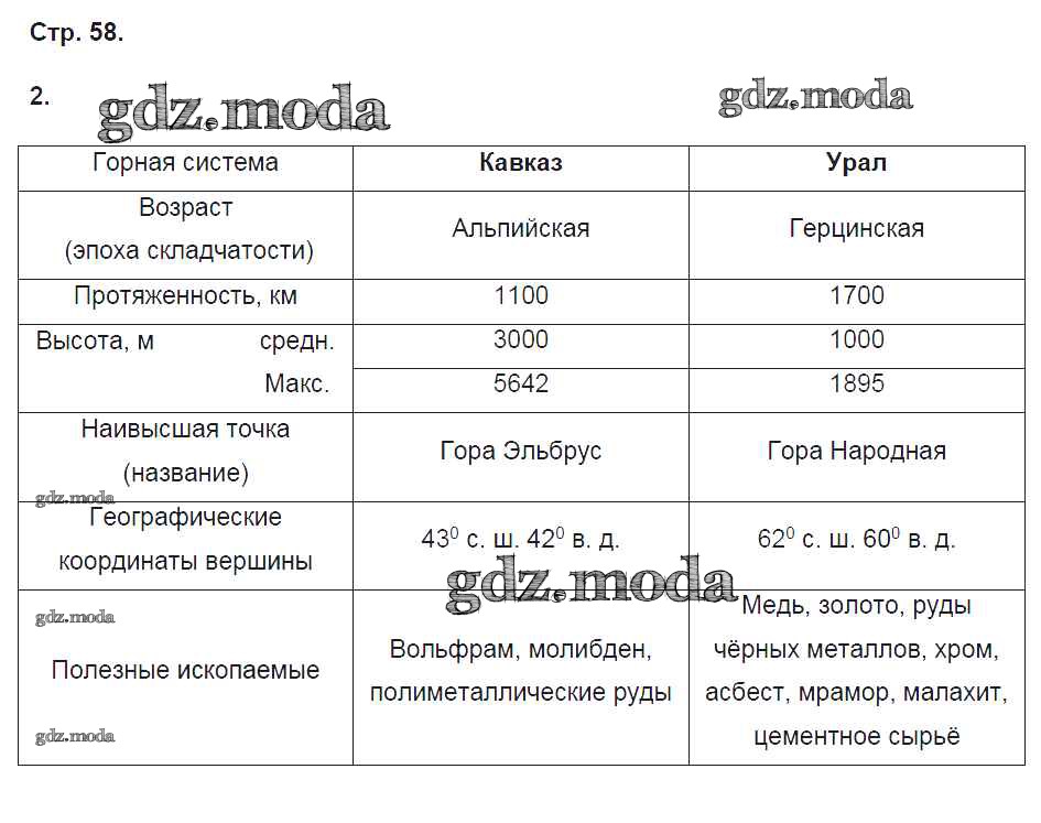 ГДЗ решение к заданию № 58 География 8 класс рабочая тетрадь Домогацких Е.М. Русское слово 2017 Часть 1, Часть 2 ФГОС бесплатно на гдз.мода!