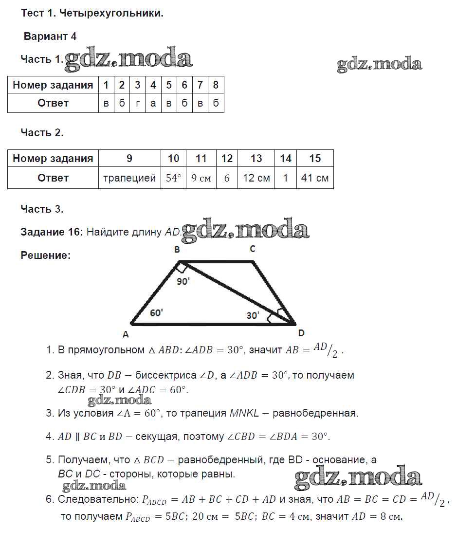 ГДЗ решение к заданию № вариант №4 Геометрия 8 класс тесты Фарков А.В. (к уч. Атанасяна) Экзамен 2014 ФГОС бесплатно на гдз.мода!