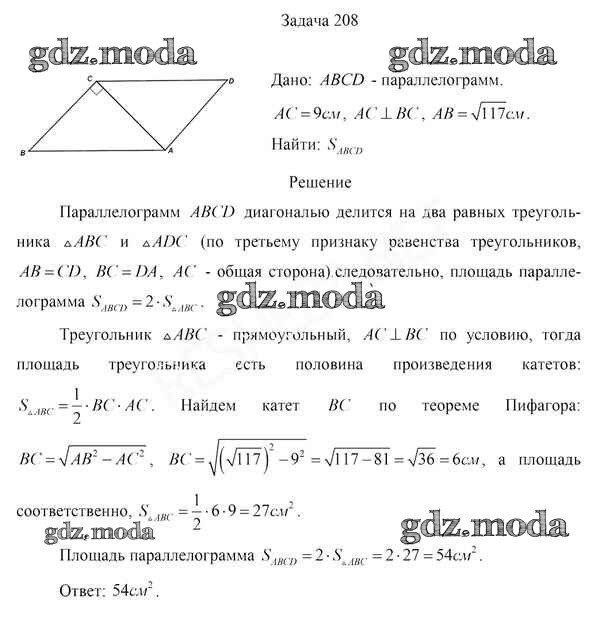ОТВЕТ на задание № 208 Учебник по Геометрии 8 класс Казаков