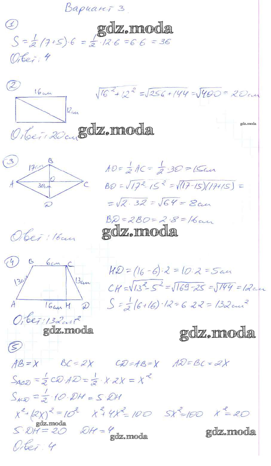 ОТВЕТ на задание № Вариант №3 Контрольные работы по Геометрии 8 класс Мельникова УМК