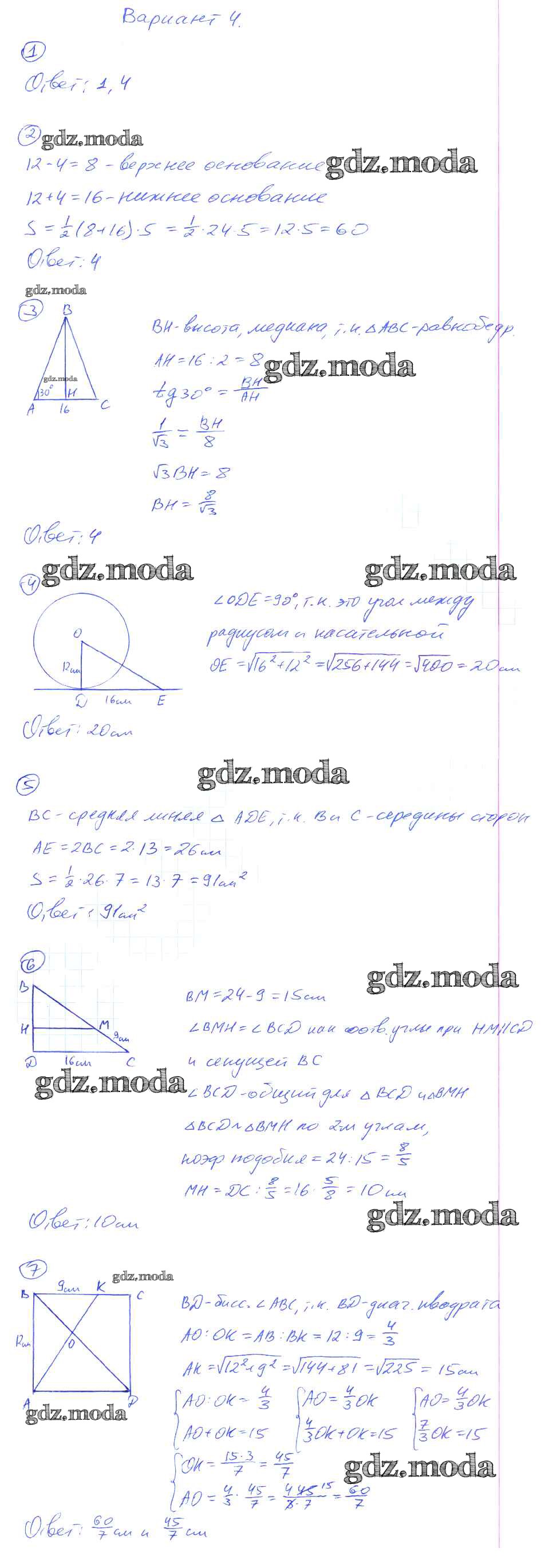 ОТВЕТ на задание № Вариант №4 Контрольные работы по Геометрии 8 класс Мельникова УМК