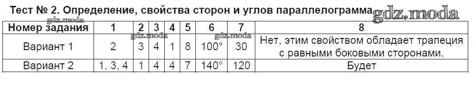 ОТВЕТ на задание № Тест №2. Определение, свойства сторон и углов параллелограмма Контрольно-измерительные материалы (КИМ) по Геометрии 8 класс Рязановский