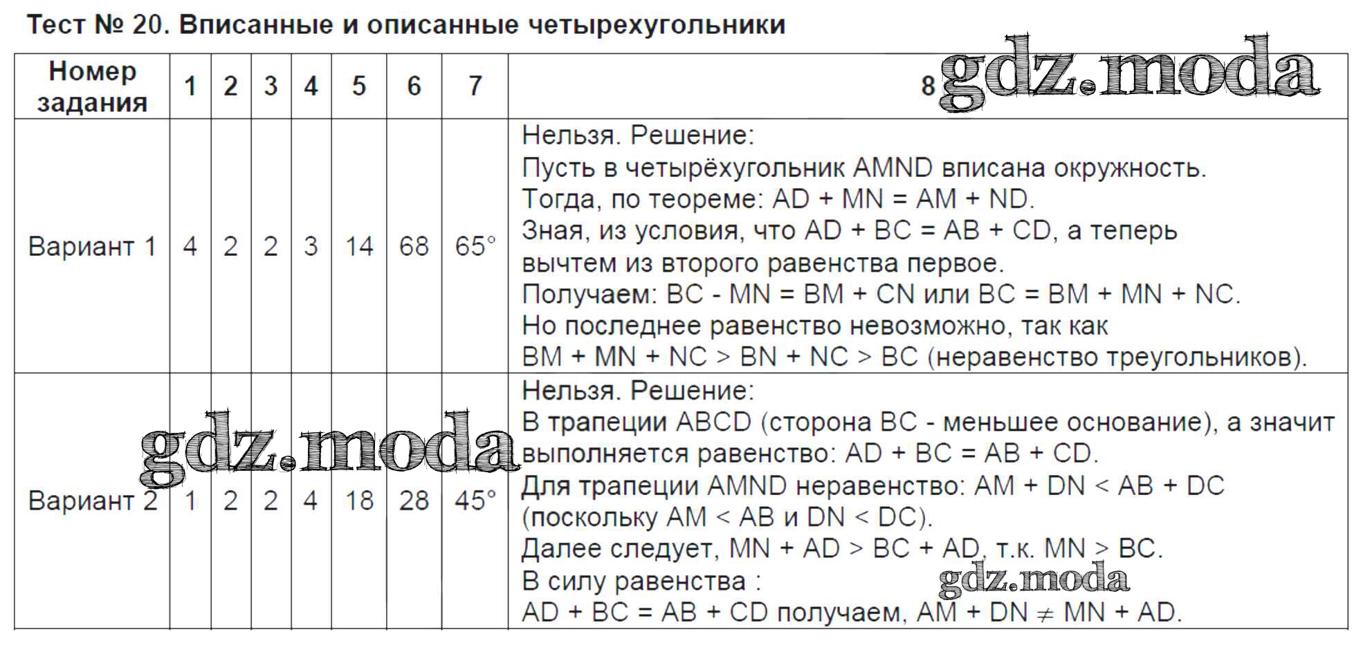 ГДЗ решение к заданию № Тест №20. Вписанные и описанные четырехугольники Геометрия 8 класс контрольно-измерительные материалы Рязановский А.Р. Экзамен 2014 ФГОС бесплатно на гдз.мода!