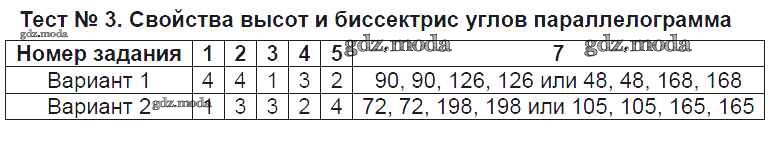 ОТВЕТ на задание № Тест №3. Свойства высот и биссектрис углов параллелограмма Контрольно-измерительные материалы (КИМ) по Геометрии 8 класс Рязановский