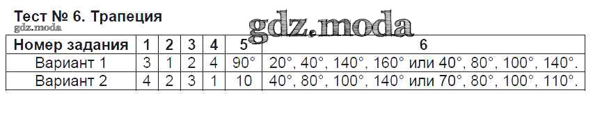 ОТВЕТ на задание № Тест №6. Трапеция Контрольно-измерительные материалы (КИМ) по Геометрии 8 класс Рязановский