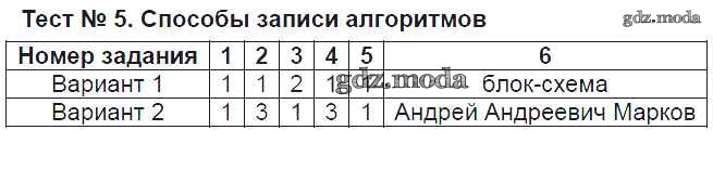 ОТВЕТ на задание № Тест №5. Способы записи алгоритмов Контрольно-измерительные материалы (КИМ) по Информатике 8 класс Масленикова