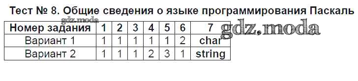 ГДЗ решение к заданию № Тест №8. Общие сведения о языке программирования Паскаль Информатика 8 класс контрольно-измерительные материалы Масленикова О.Н. ВАКО 2017 ФГОС бесплатно на гдз.мода!