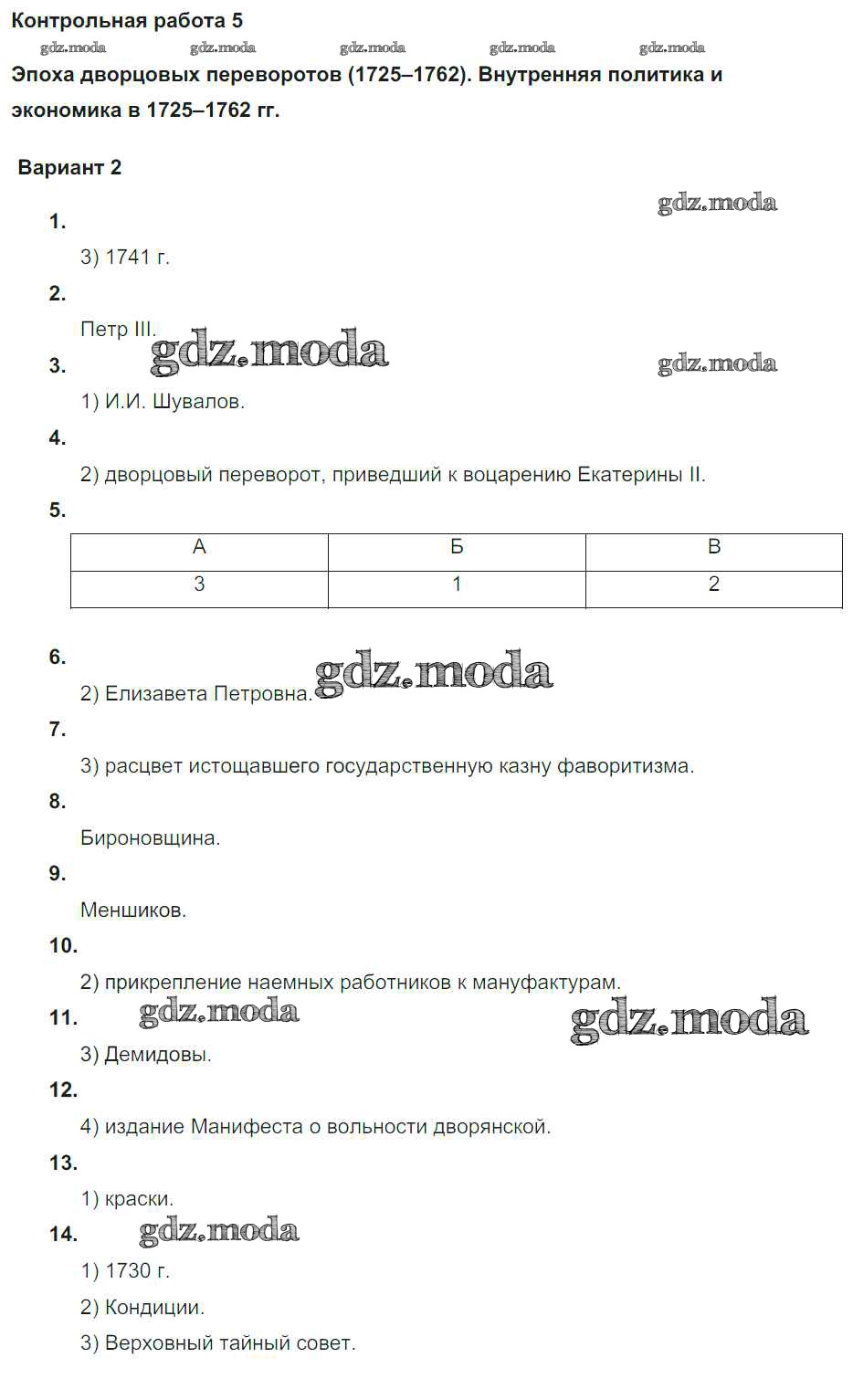 ГДЗ решение к заданию № 2 История России 8 класс контрольные работы Соловьёв Я.В. (к уч. Торкунова А.В.) Экзамен 2019 ФГОС бесплатно на гдз.мода!