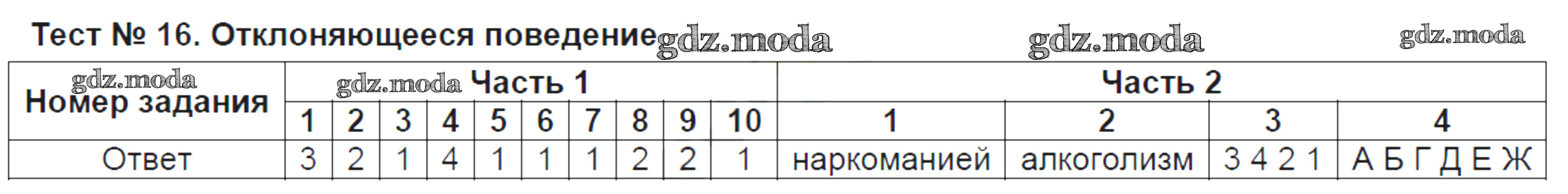 ГДЗ решение к заданию № Тест №16. Отклоняющееся поведение Обществознание 8 класс тесты Краюшкина С.В. (к уч. Боголюбова) Экзамен 2017 ФГОС бесплатно на гдз.мода!