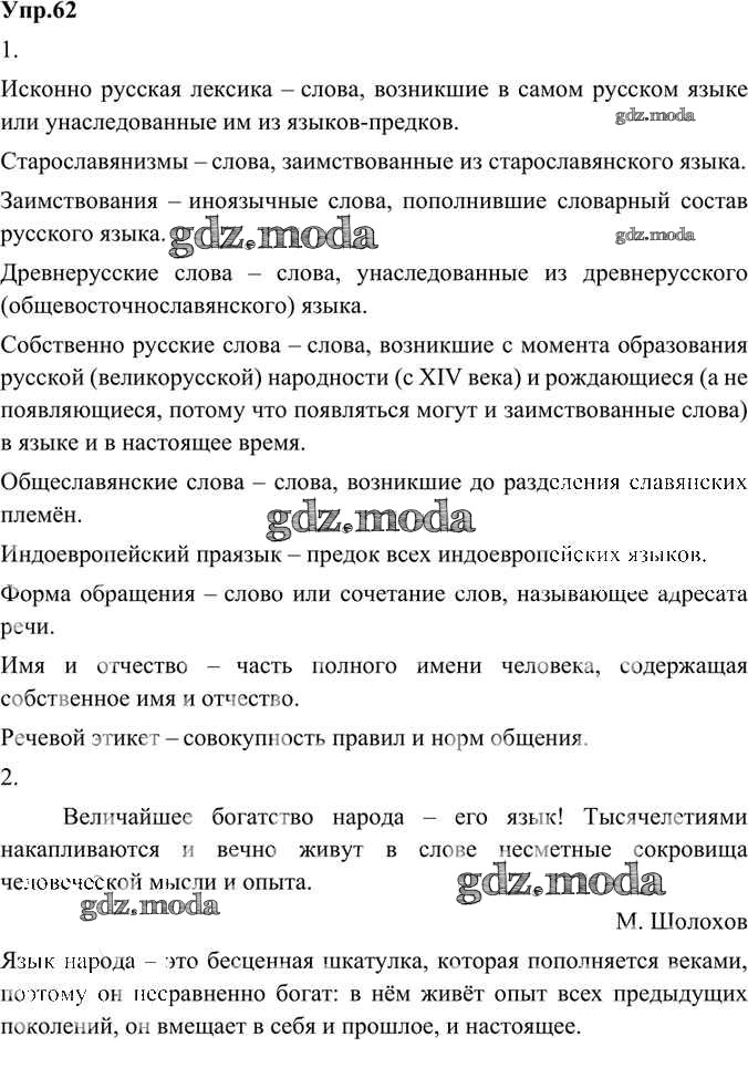 ГДЗ решение к заданию № 62 Русский родной язык 8 класс Александрова О.М. Просвещение 2020 ФГОС бесплатно на гдз.мода!