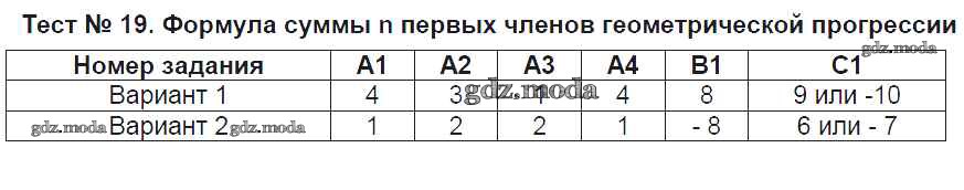 ГДЗ решение к заданию № Тест №19. Формула суммы n первых членов геометрической прогрессии Алгебра 9 класс контрольно-измерительные материалы (КИМ) Мартышова Л.И. ВАКО 2015 ФГОС бесплатно на гдз.мода!