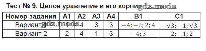ГДЗ решение к заданию № Тест №9. Целое уравнение и его корни Алгебра 9 класс контрольно-измерительные материалы (КИМ) Мартышова Л.И. ВАКО 2015 ФГОС бесплатно на гдз.мода!
