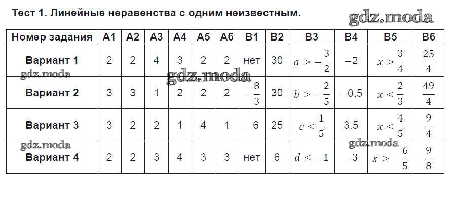ГДЗ решение к заданию № Тест №1. Линейные неравенства с одним неизвестным Алгебра 9 класс Тематические тесты Чулков П.В. Просвещение 2017 ФГОС бесплатно на гдз.мода!