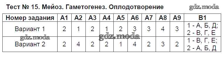 ГДЗ решение к заданию № Тест №15. Мейоз. Гаметогенез. Оплодотворение Биология 9 класс контрольно-измерительные материалы Богданов Н.А. ВАКО 2017 ФГОС бесплатно на гдз.мода!