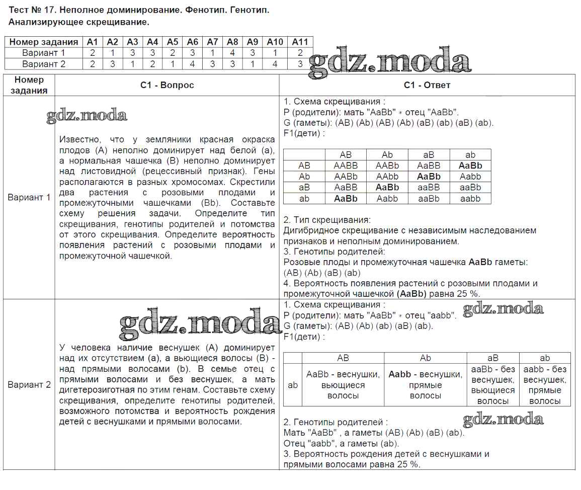 ГДЗ решение к заданию № Тест №17. Неполное доминирование. Фенотип. Генотип. Анализирующее скрещивание Биология 9 класс контрольно-измерительные материалы Богданов Н.А. ВАКО 2017 ФГОС бесплатно на гдз.мода!